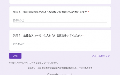 任命式の後、教室に戻って生徒会スローガンアンケートをフォームで実施しました。全校生徒の思いが入った素晴らしい生徒会スローガンになることを期待します。