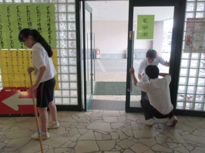 3年生の清掃の様子です。生徒玄関の扉や周辺を念入りに掃除しています。