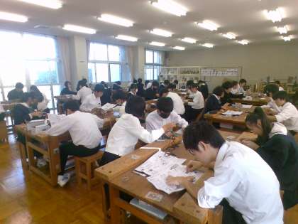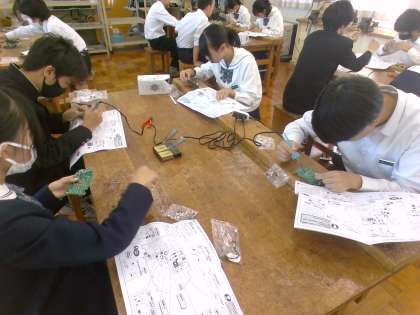 ダイナモラジオの製作に取り組んでいます。部品の取り付けミス、火傷に注意して作業を進めています。