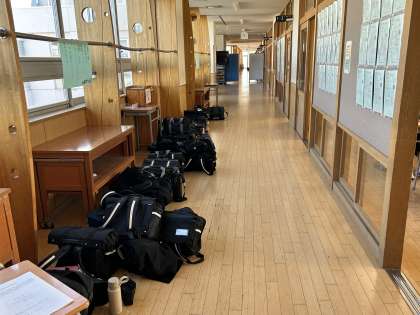 中教研学力調査中です。廊下には生徒のカバンが並べられています。