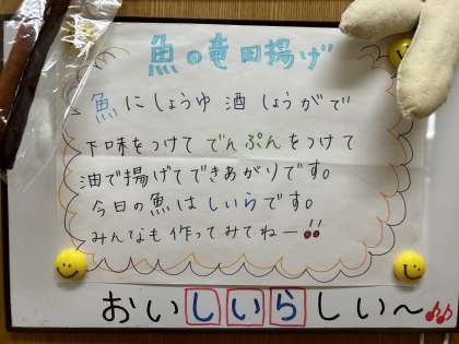 今日の給食室からのお知らせに、今日の魚はシイラ。