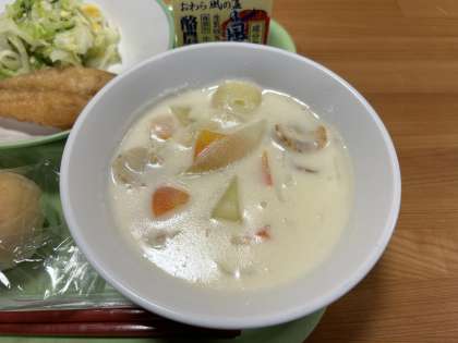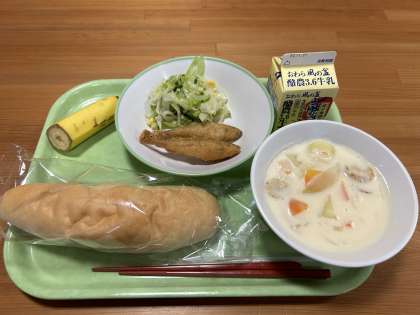 クラムチャウダーにホタテ。コールスローサラダにはコーン。そしてわかさぎ。今日のテーマは北海道ですかね。