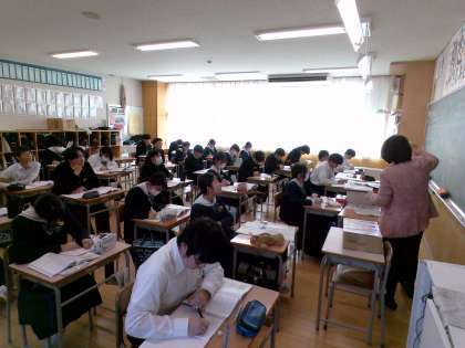 1組国語、2組社会、3組数学の様子です。国語の授業では、書き初めの練習をしていました。今年度の課題は「国際交流」です。行書で落ち着いて書いています。
