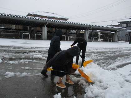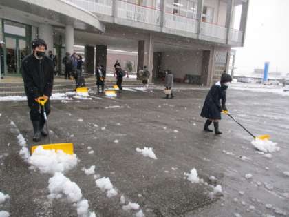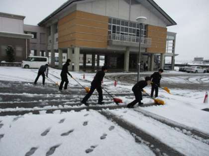 積雪の朝を迎えました。本日の除雪当番は3年2組。一生懸命、除雪ボランティアをしていました。