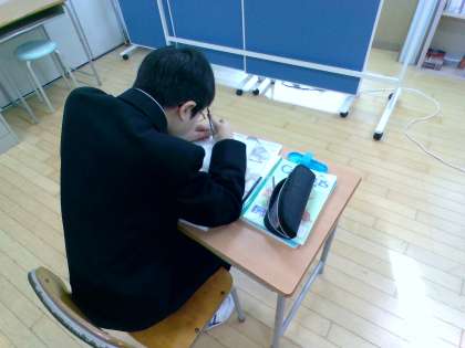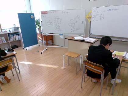 2組数学の様子です。3年生は、三平方の定理の利用、1年生は、作図の演習問題に取り組んでいます。