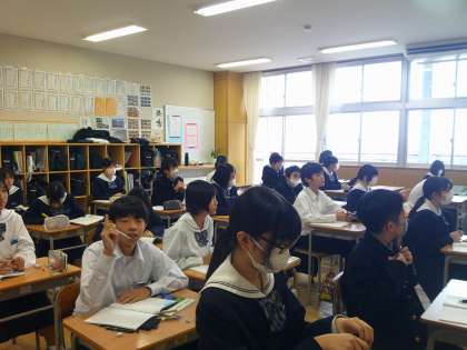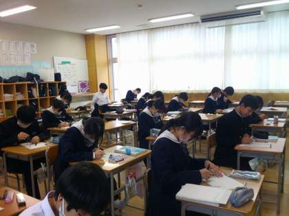 1組は英語の問題を解いています。2組は数学で作図問題を解いています。