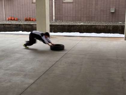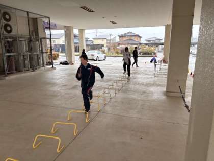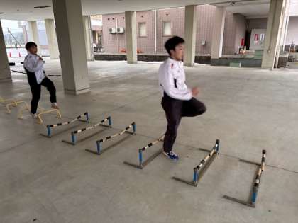 陸上競技部の活動の様子です。 ピロティで基礎練習を行いました。