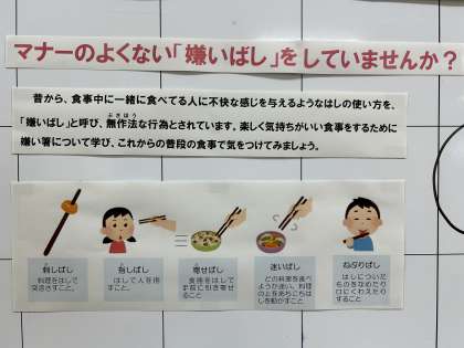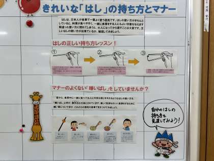 給食室前のボードに、きれいな「はし」の持ち方とマナーについての掲示があります。