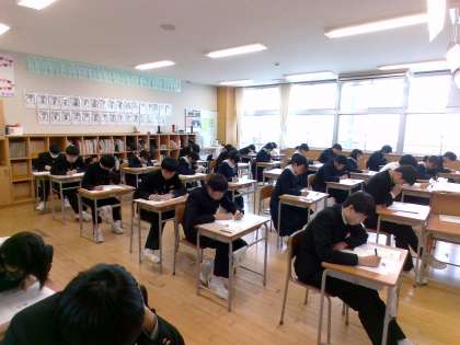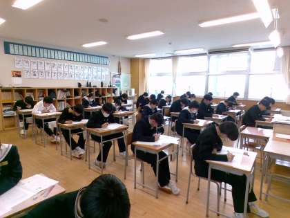 入試に向けた確認テストを行っています。今日は、社会、国語、理科の3教科です。頑張れ受検生!