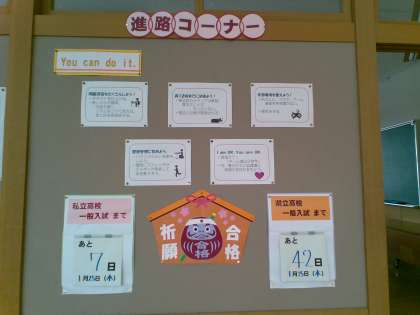 3年生の廊下には、合格を祈願した「だるま」が登場しました!アドバイスも掲示されています!