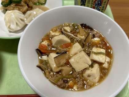 今日はでんぷんが高かったのでしょうか?ちょっとゆるかったので、ごはんを入れて丼でいただきました。汁を吸った米粒がサイコーです。