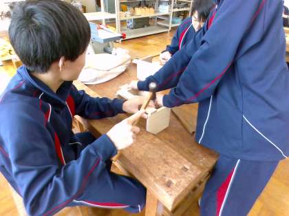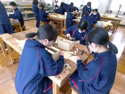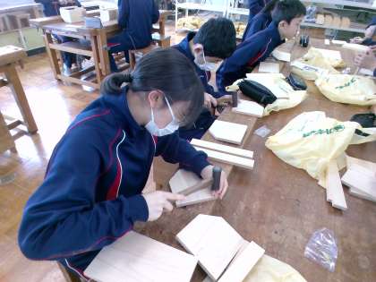 3組のブックケース製作の様子です。多くの生徒が組み立てに入っています。背板の取り付けに苦労しているようです。