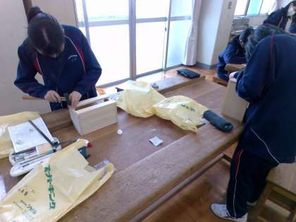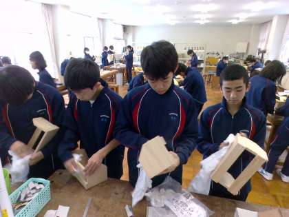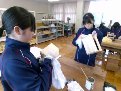 3組の様子です。ブックケースの製作は、素地調整から塗装に入っています。塗装方法はオイルフィニッシュという方法です。