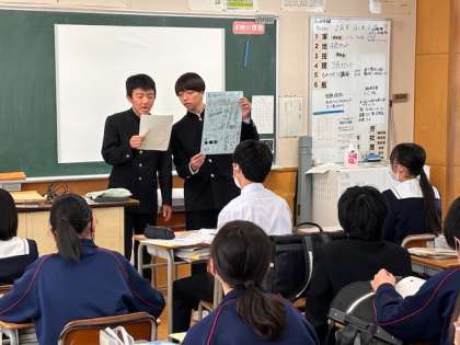 3年1組は、後輩への学習会を開き、入試に出題されている1・2年生の問題を解いたり、学年末考査への対策等を行ったりします。