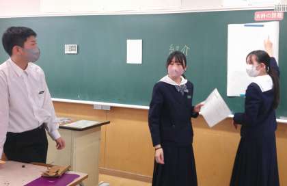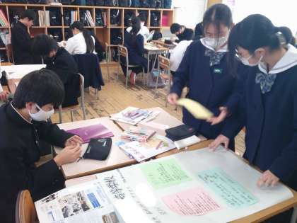 高校について調べ、班ごとに協力して掲示用の資料を作っています。