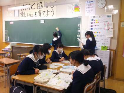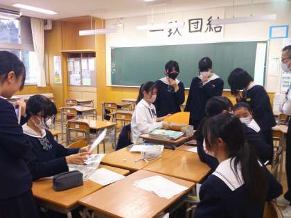 理科と社会、英語と国語についても、それぞれのクラスで3年生が質問に答えてくれていました。グループになって、1年生に詳しく説明してくれています。