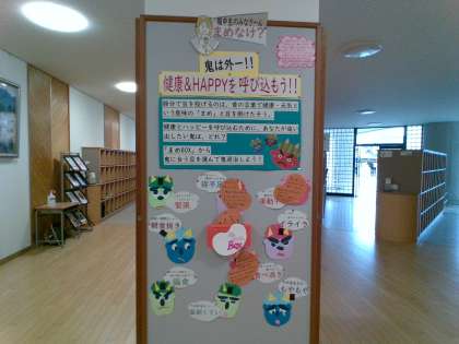 2月は、節分がある月です。節分の豆まきをモチーフに、健康に関する「豆情報」が「豆」に書かれています。一度、豆を投げてみませんか?