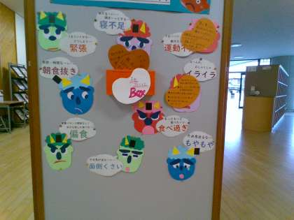 生徒玄関には、「健康&HAPPYを呼び込もう」と題して、健康に関する掲示をしています。