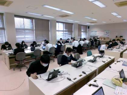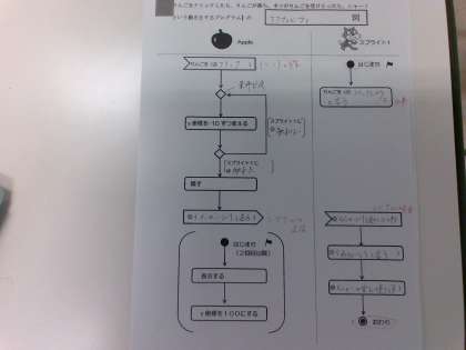 1組の様子です。プログラミングの学習をしています。今日は、アクティビティ図と呼ばれる設計図をもとに、所定の動きを組み立てました。