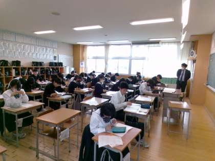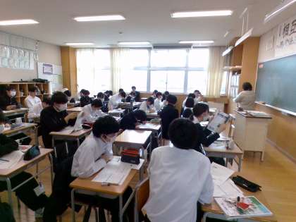 1組理科、2組数学の様子です。廊下には、学年末考査に向けて「学習時間UP大作成」と銘を打った掲示物がありました。クラスメイトみんなで高め合い、学習に励みましょう。