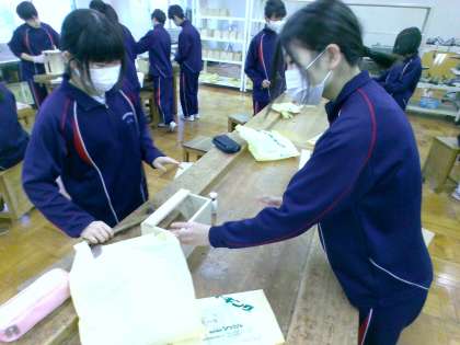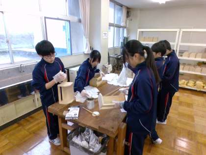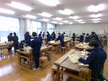 1組のブックケース製作の様子です。完成した生徒も出てきました。「心を込めて大事につくる」、ありきたりな言葉ですが、ものづくりの基本です。