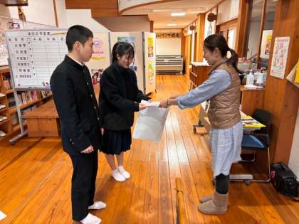 先日、音川交流センターから贈呈いただいた合格箸のお礼に、生徒が同センターを訪問しました。