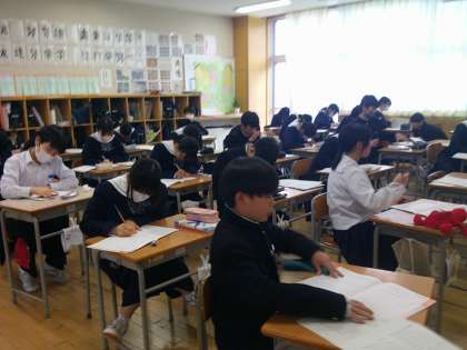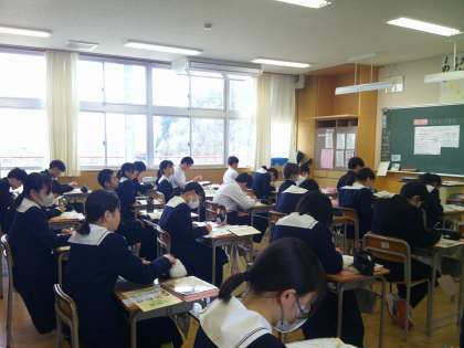 1組は国語の授業でした。3組は家庭科の授業でスライドを見ながら説明を聞いていました。どのクラスも真剣に話を聞いていました。
