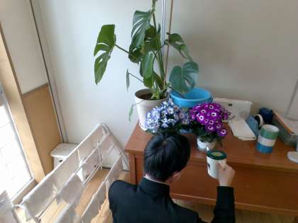 2組の様子です。入学式に飾ってあった花鉢をクラスに置きました。サイネリアは、管理が難しいですが、水やりを忘れず、長持ちさせたいと思います。
