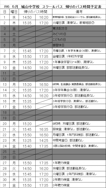5月のスクールバス運行予定表です。ご確認ください。