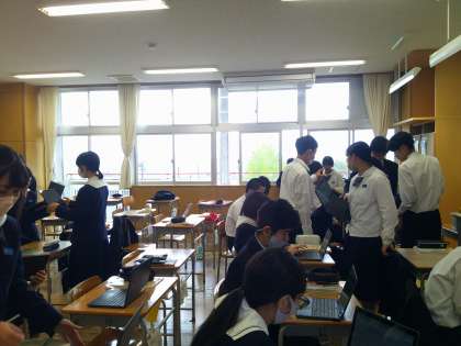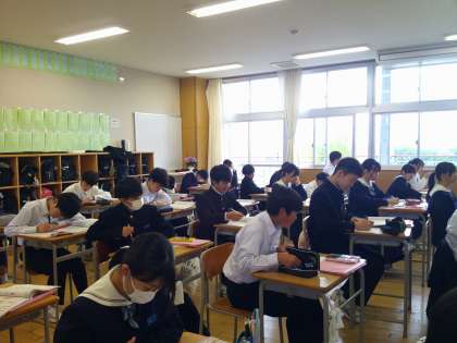1組は家庭科で季節の服装について学んでいました。2組は体力測定の説明を聞いているところです。3組の英語では話す活動をしていました。