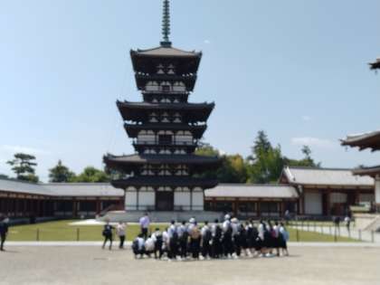 1組です。薬師寺の国宝、東塔付近でクラス写真撮影中です。このあと、東大寺に向かいます。