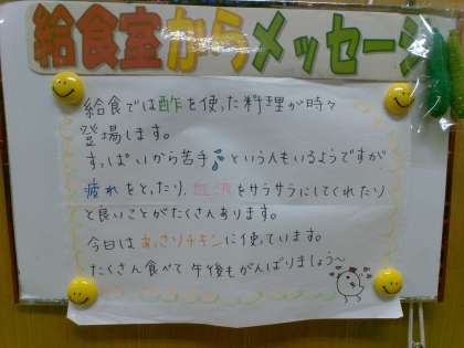 和える、即ち食材に何らかの調味料を足して絡ませることで、それぞれの味が引き立ちます。世の中と同じで、いろいろな人が程よく絡んで、相手のことを受け入れながら、自らの個性も発揮する。そのための調味料のような人になりたい、そんな思いを抱いた給食のひとときでした。