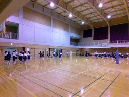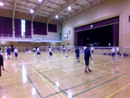 体育館の様子です。男女バドミントン部と男女バレーボール部が元気に活動していました。