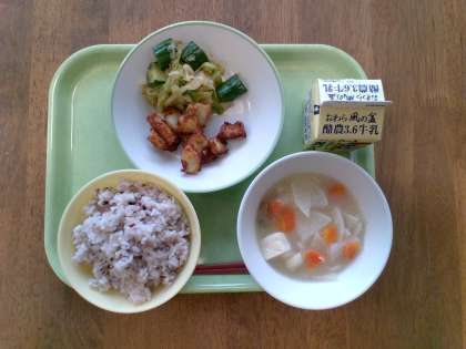 本日は「かみかみ献立」 いかのかりん揚げ 華風和え  すいとん 雑穀入りごはん 牛乳 です。