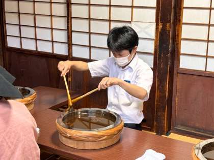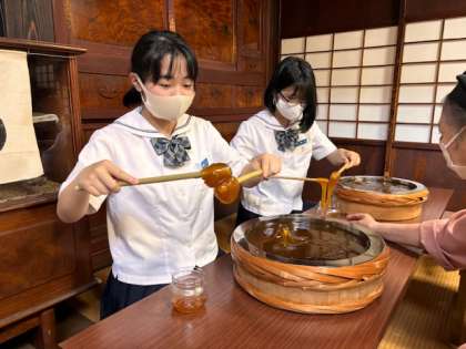あめの俵屋さんにて、飴の瓶詰め体験の様子です。