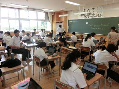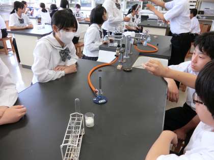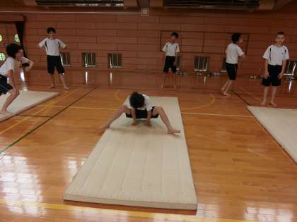 1組は英語、2組は体育でマット運動、3組は理科で実験に取り組んでいます。