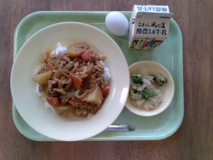 カレーライス ゆで卵 花野菜サラダ ごはん 牛乳