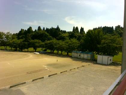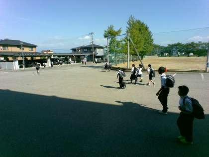 「万緑の 中や吾子の歯 生え初むる」草田男の句を思い浮かべざるを得ない、美しい緑と少しの白い雲に見守られての下校の様子です。