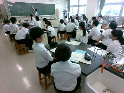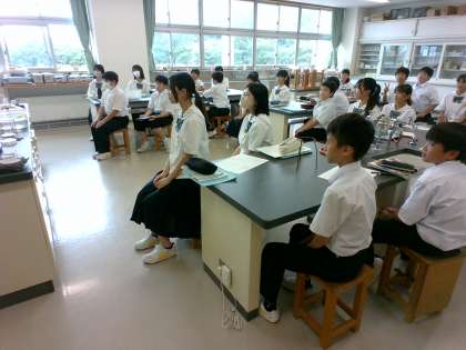 間もなく実験開始。背筋と床が直角になるくらい姿勢よく先生の話を聞いていますね。