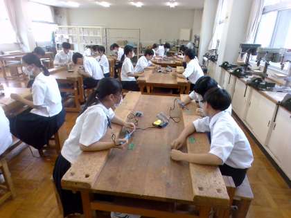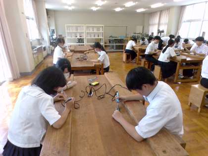 2組技術の様子です。はんだ付けの練習をしました。火傷をしないように落ち着いて取り組みました。