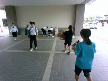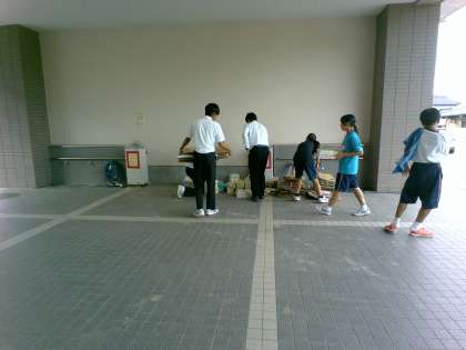 ボランティア委員会です。明日の資源回収に出す段ボール等を運び出しています。
