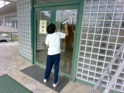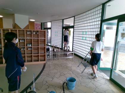 体験先の休業日等で、本日は校内で「社会に学ぶ『14歳の挑戦』」を実施中の2年生の皆さんです。学校のあちこちの汚れを取ってくれました。