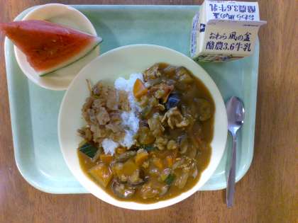 夏野菜カレー 福神漬け すいか ごはん 牛乳