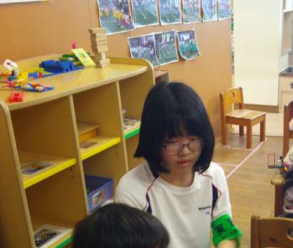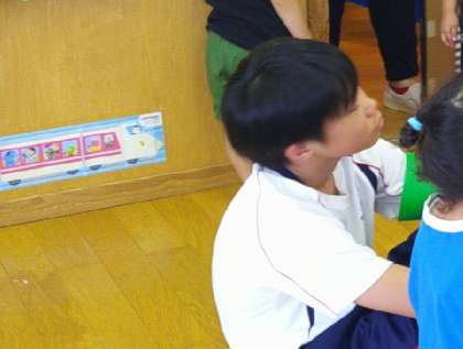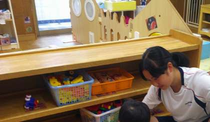 保育園の先生方の話を子供たちと一緒に聞いたり、お世話をしたりしていました。子供たちへの接し方をいろいろ教わっています。