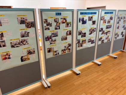 事業所が定休日等で学校で活動した生徒が、各事業所ごとの活動中の写真を掲示してくれました。