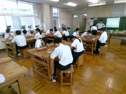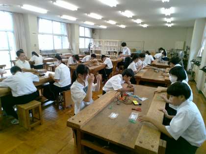 2組は、技術室ではんだ付けの真っ最中。 火傷しないように気を付けて。
