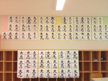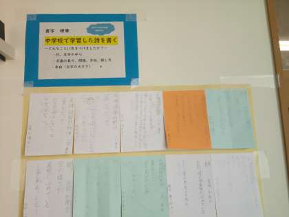 硬筆作品は、ベンチコーナー付近に。毛筆作品は、E教室に展示してあります。