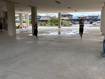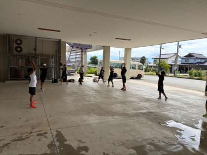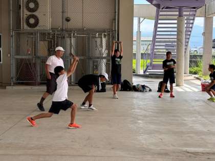 陸上競技部の活動の様子です。 日陰で基礎体力づくりを行いました。
