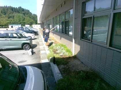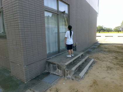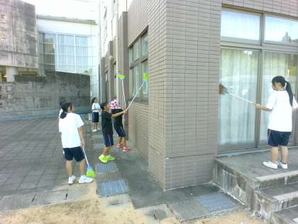 校舎外壁や窓ガラスの枠に付いているクモの巣を取ってくれています。
