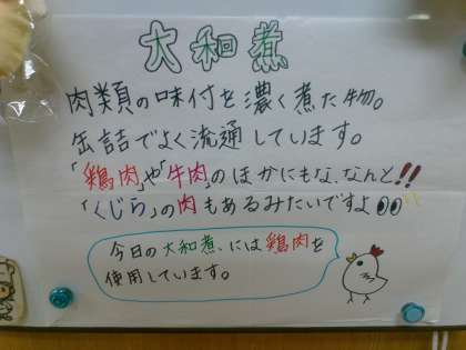 今日の大和煮には鶏肉が使用されていますが、掲示によると「くじらの肉」も使われることがあるのですね。直近でくじらを食したのは、一体いつだったか・・・思い出せません。